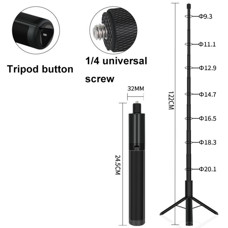 2. Press the PUSH button on the bottom to open the tripod, simple and convenient