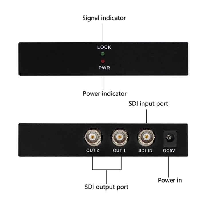 1. SDI distribution function: Connect the hardware according to the three “installation steps”, and the SDI splitter will start to work normally. The SDI splitter supports SD-SDI (270Mbps), high-definition HD-SDI (1.485Gbps) and full high-definition 3G-SDI (2.97 Gbps) video format, SDI video distribution