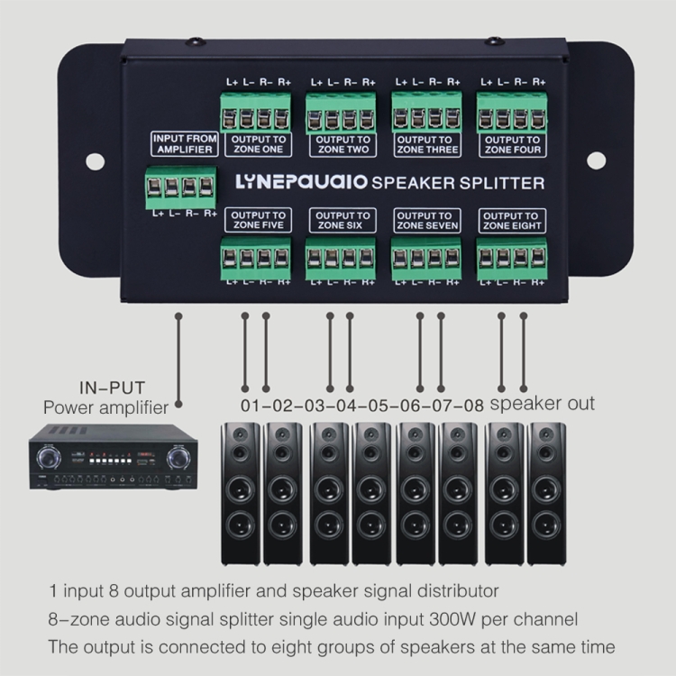 1 In 8 Out Amplifier And Sound Speaker Distributor, 8-Area Sound Source, Signal Distribution Panel, Audio Input, 300W Per Channel