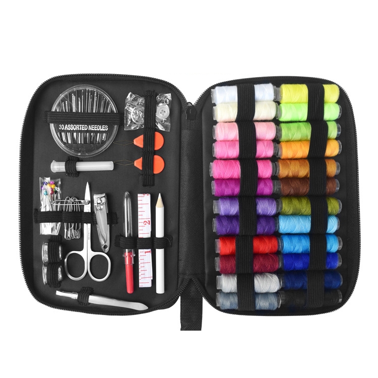 -97 PCS: Coil x 22, Color Coil x 2, Dial x 1, Black Button x 3, White Button x 3, Concealed Button x 3, Needle Threader x 2, Elastic Clip x 1, Marking Pen x 1, stitch remover x 1, eyebrow clip x 1, metal thimble x 2, tape measure x 1, scissors x 1, nail clippers x 1, pearl needle x 10, large pin x 5, syringe x 1, pin x 5. Storage bag x 1