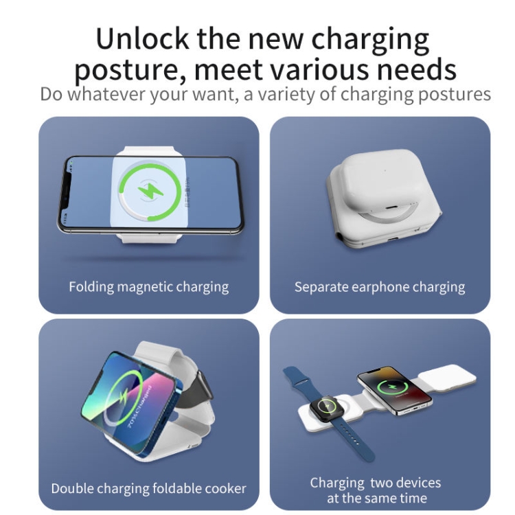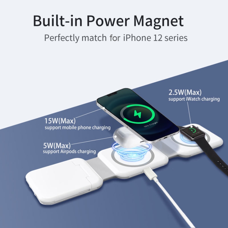 1. Three-in-one magnetic wireless charger, the middle magnetic wireless charger can charge mobile phones and headphones, and can charge two devices at the same time;