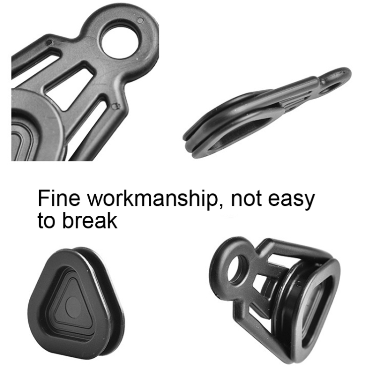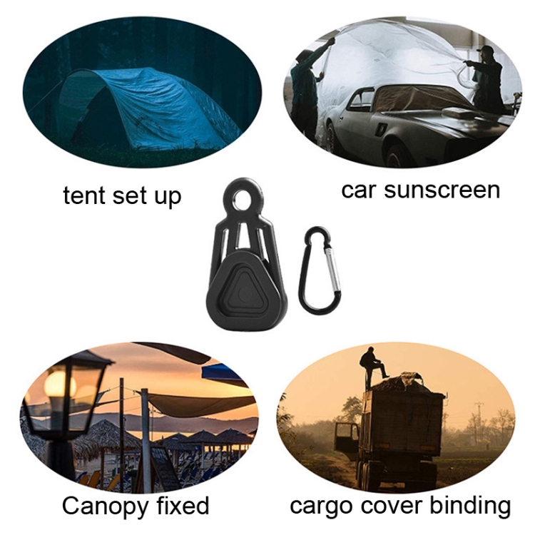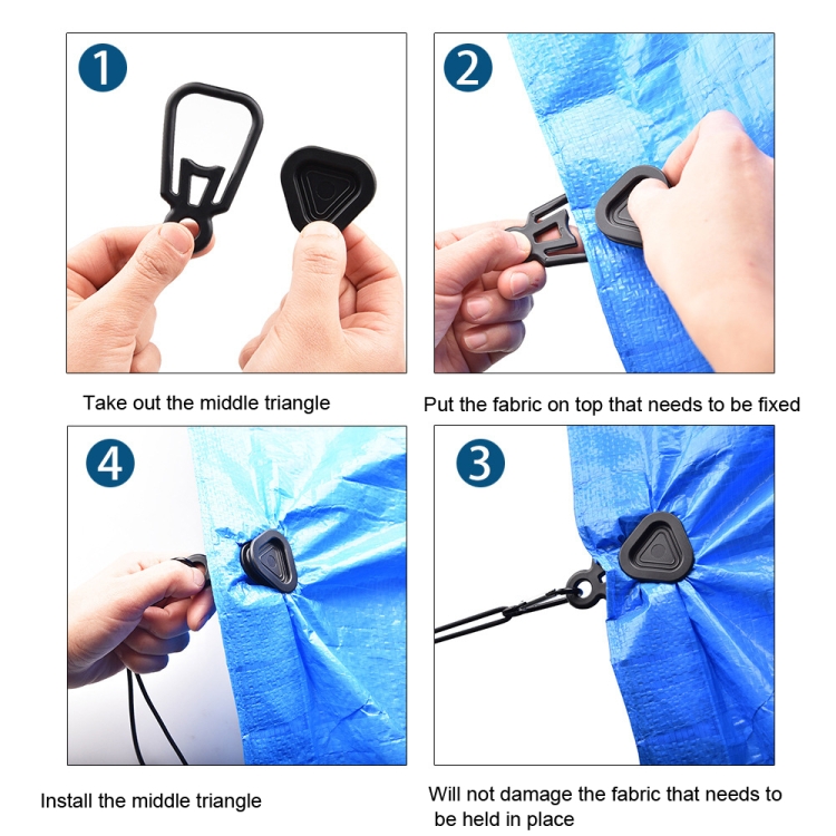 3. The tent clip has an inner triangle lock and an outer ring, which can prevent the tarpaulin from falling more stably; no need to punch holes in the tarpaulin, it is easy to remove after use, leaving only a little wrinkle.