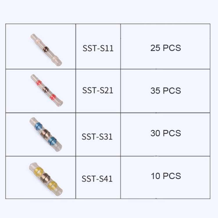 | Option | Heat Shrinkable Terminals, 0.5-1.5mm Red, 0.25-0.34mm White, 4-6mm Yellow, 1.5-2.5mm Blue, 100 PCS / Set |