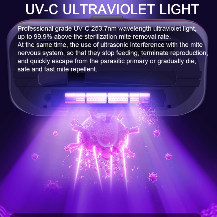 2. 253.7nm wavelength ultraviolet light, up to 99.9% of the sterilization rate of mites. At the same time, the ultrasonic wave interferes with the mite’s nervous system to make it stop feeding and terminate reproduction, which is safe and fast to drive away mites.