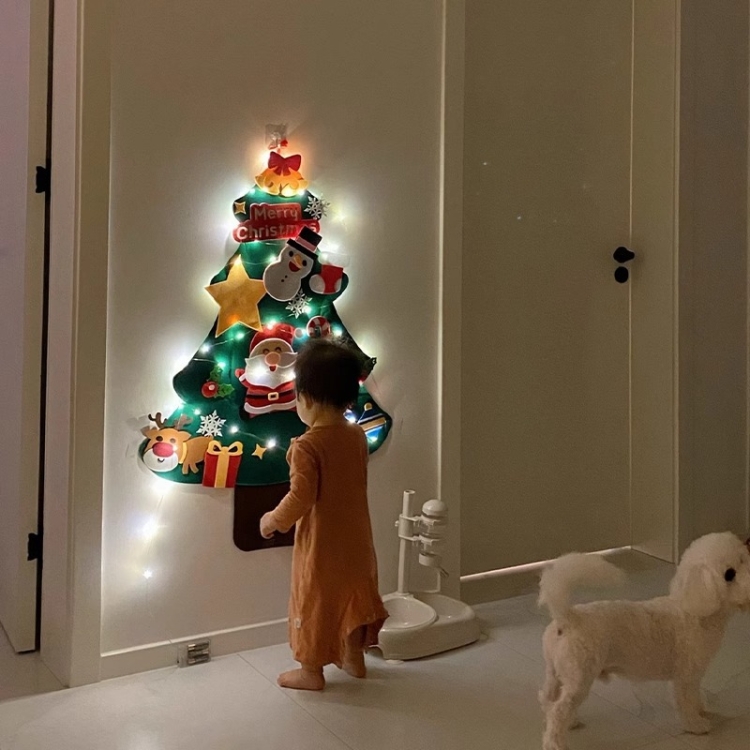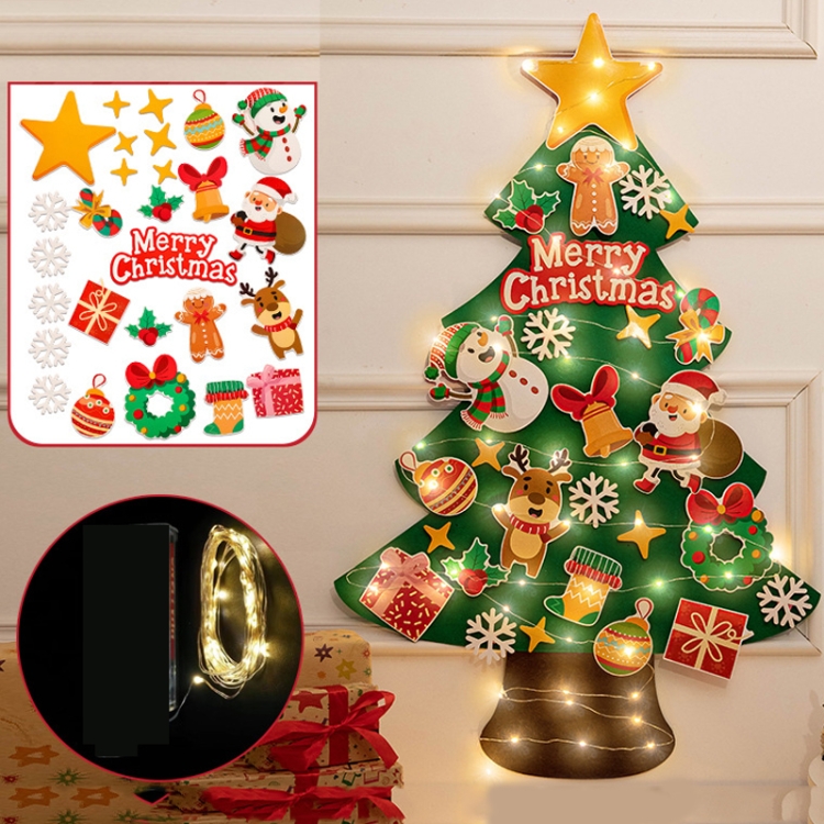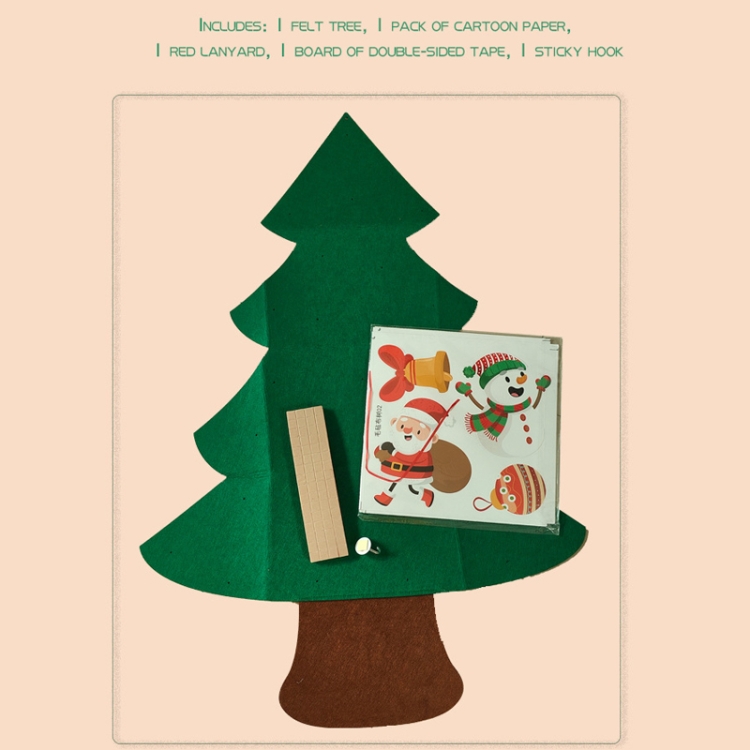 Packing list: 1 felt tree, 1 pack of cartoon decorative paper, 1 red hanging rope, 1 double-sided tape board, 1 sticky hook, light string (optional)