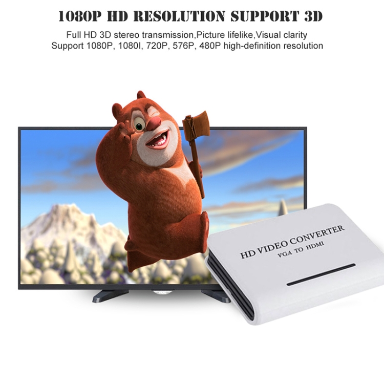 * VGA to HDMI Converter box converts PC VGA and audio to HDMI, allowing connection of PC to 1080p HDTV. It supports multiple resolution up to 1920×1080/60HZ. while it supports the most popular resolutions to ensure high compatibility with wide brands of PCs and HDTVs. It provides cheaper solution of connecting PC to HDTV.