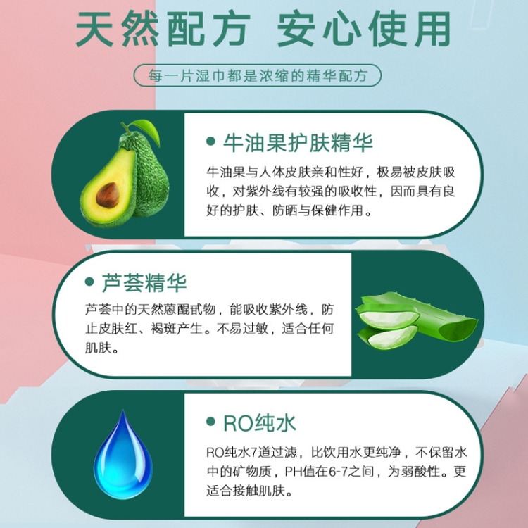 1. Main ingredients: spunlace, RO water, avocado extract, aloe vera, etc