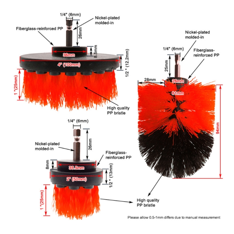 1. Product specifications: 4 brush heads (2 inch 3.5 inch, 4 inch, 5 inch), 6 pieces of sponge, 1 piece of 15 cm telescopic rod, 1 piece of 4 inch sticking plate and screw