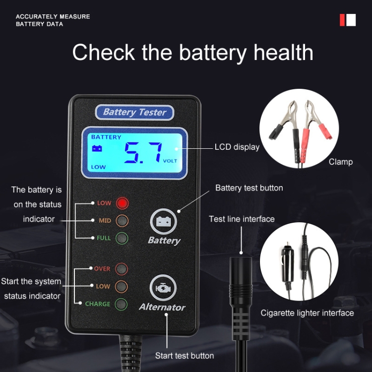 4. It can be directly plugged into the cigarette lighter socket in the car for testing, or the included alligator clip can be clipped to the battery terminal for testing.
