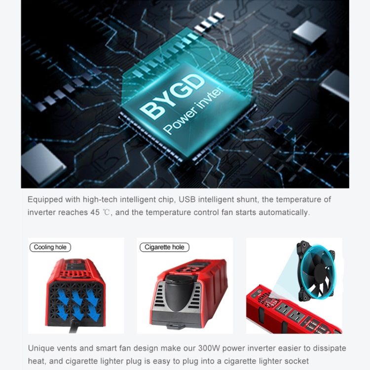 1. Equipped with high-tech intelligent chip, USB intelligent shunt, the temperature of inverter reaches 45 degree Celsius, and the temperature control fan stats automatically.