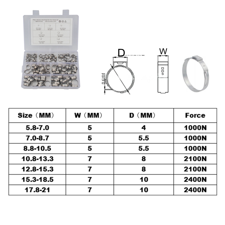130 PCS Adjustable Single Ear Plus Stainless Steel Hydraulic Hose Clamps O-Clips Pipe Fuel Air with Ear Clamp Pincer Inside Diameter Range: 5.8-21mm
