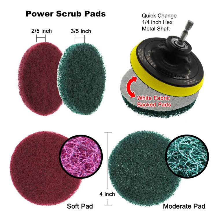 1. Product specifications: 5 brush heads (2″*1, 3.5″*1, 4″*2, 5″*1), 6 4″ scouring pads, 2 4″ sponges, 1 15cm telescopic rod , 1 4 inch sticky plate with screws
