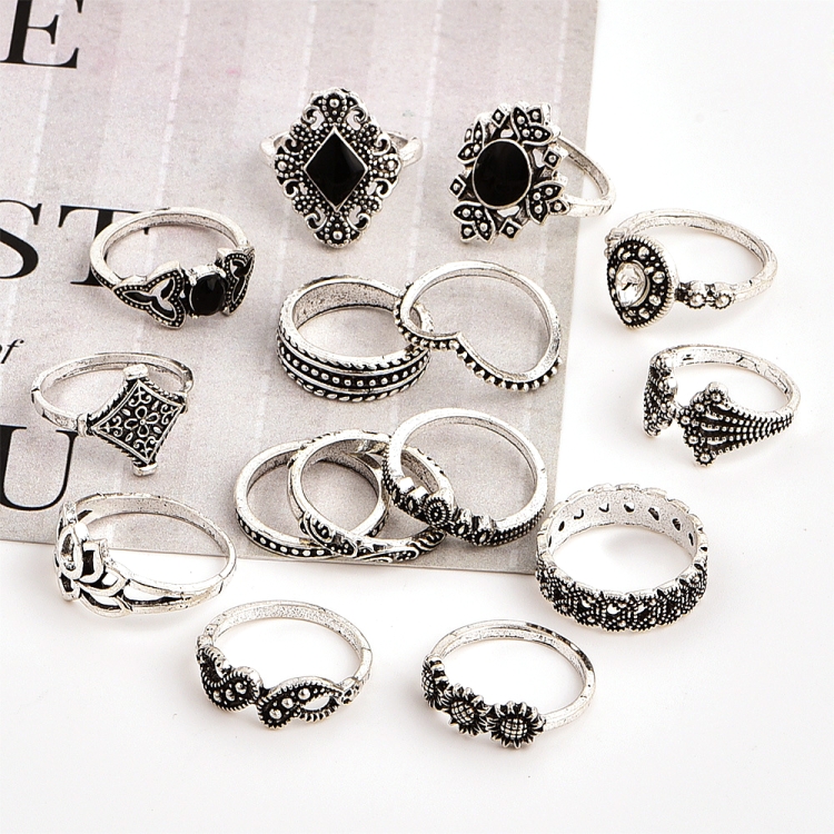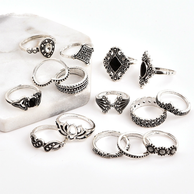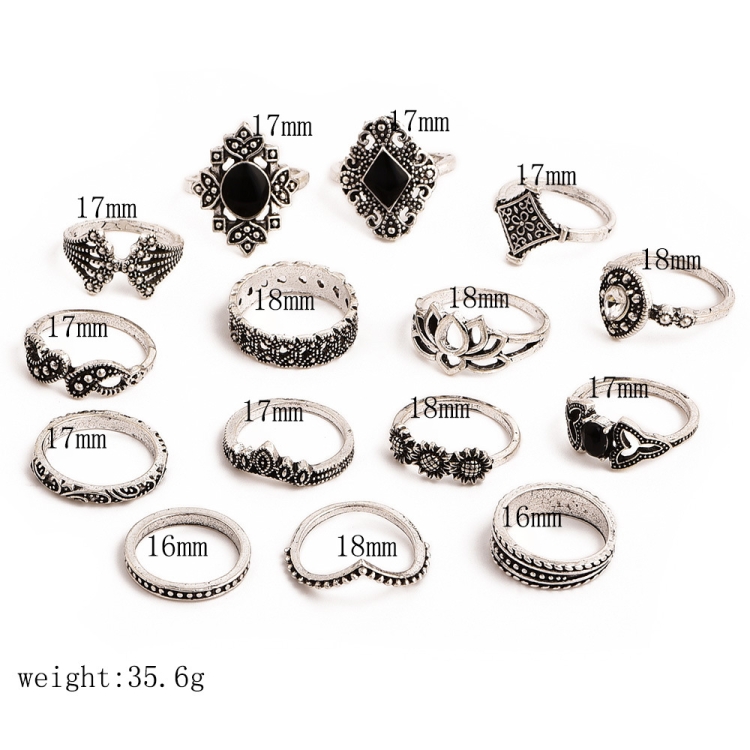 15 PCS Bohemian Retro Crystal Flower Leaves Hollow Lotus Gem Silver Ring Set