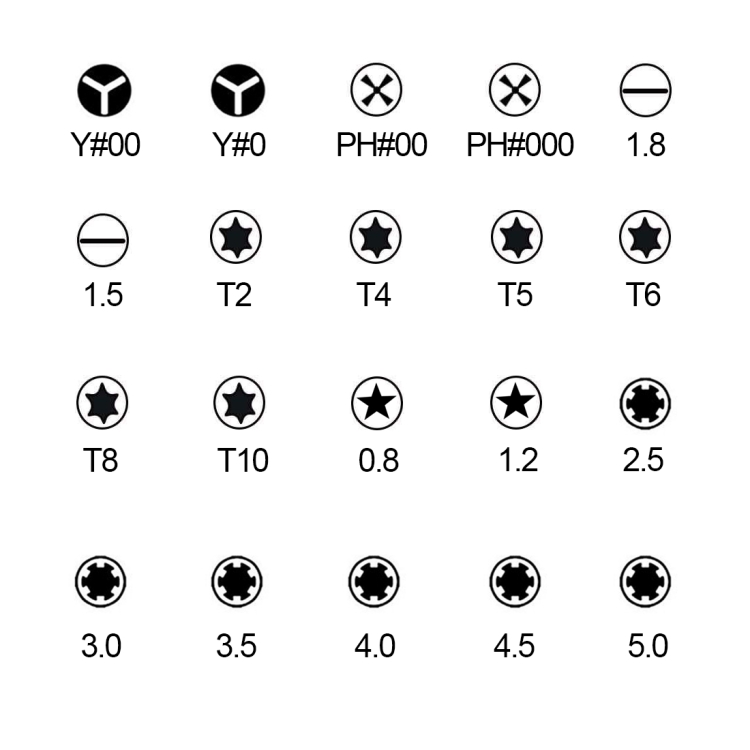– 14 x Bits (“Y” shape: 2.0, 3.0, Phillips: PH000, PH00, Straight: 1.5, 1.8, Torx: T2, T4, T8, T10, T6, T5, Five star: 0.8, 1.2, Nut Driver: 4.5, 2.5, 4.0, 3.5, 3.0, 5.0, 5.5)