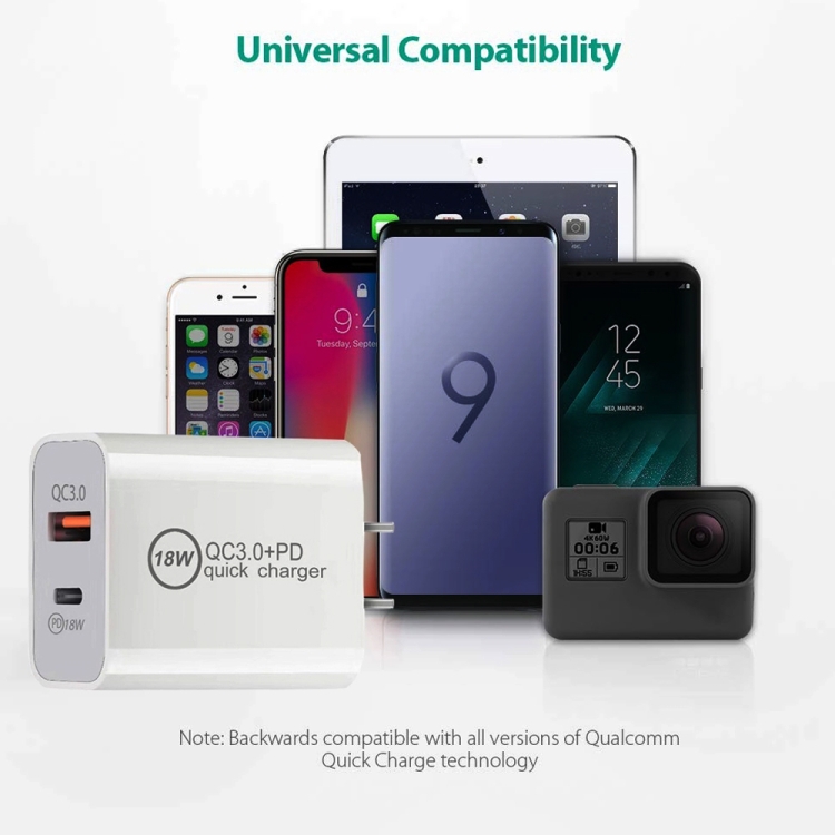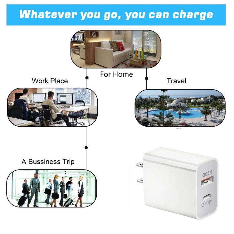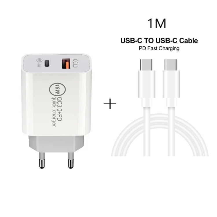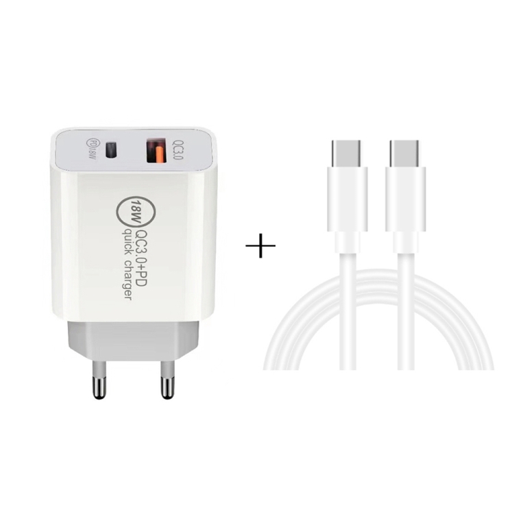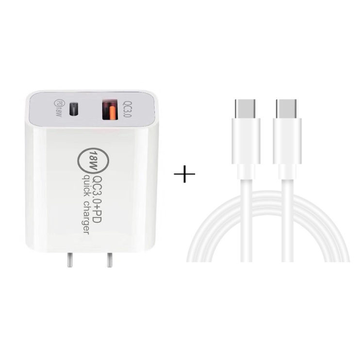 18W PD 3.0 Type-C / USB-C + QC 3.0 USB Dual Fast Charging Universal Travel Charger with Type-C / USB-C to Type-C / USB-C Fast Charging Data Cable,