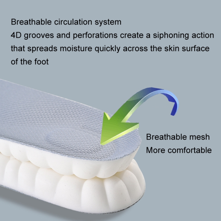 3. Circulation breathable system, 4D grooves and ventilation holes together produce siphon effect to drive the rapid diffusion of moisture on the surface of the foot