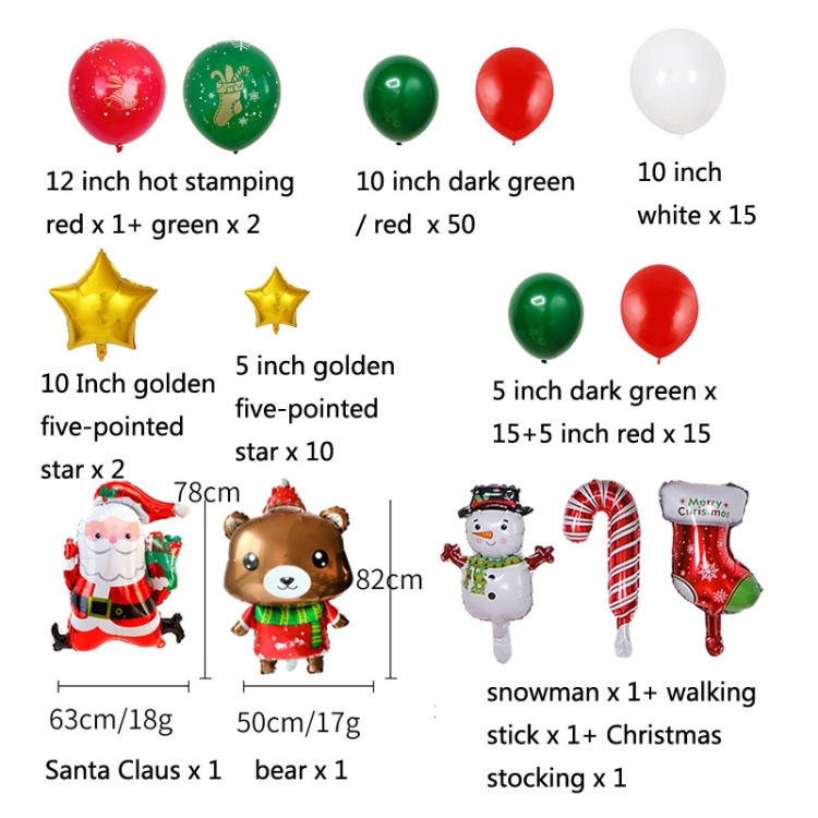 8. Gift specifications: 10 inch dark green x 50+10 inch red x 50+12 inch hot stamping red x 1+12 inch hot stamping green x 2+10 inch white x 15+5 inch dark green x 15+5 inch red x 15+10 Inch golden five-pointed star x 2+5 inch golden five-pointed star x 10+ Santa Claus x 1+ bear x 1+ walking stick x 2