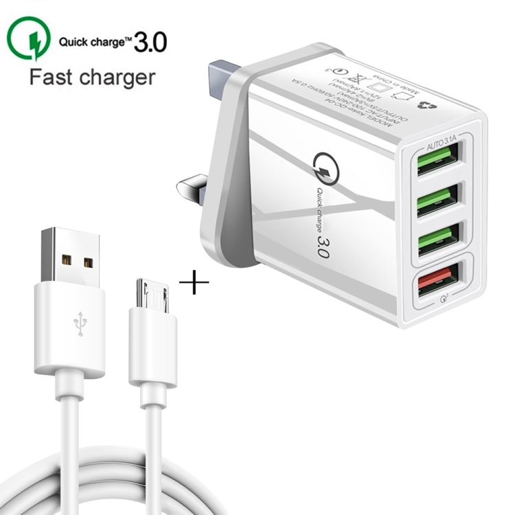 2 in 1 1m USB to Micro USB Data Cable + 30W QC 3.0 4 USB Interfaces Mobile Phone Tablet PC Universal Quick Charger Travel Charger Set, UK Plug