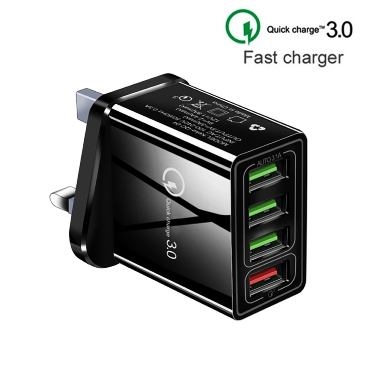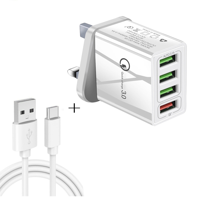 2 in 1 1m USB to USB-C / Type-C Data Cable + 30W QC 3.0 4 USB Interfaces Mobile Phone Tablet PC Universal Quick Charger Travel Charger Set, UK Plug