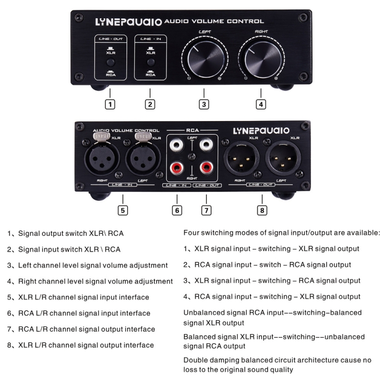 2 In and 2 Out Switcher Volume Controller, RCA signal switches to XLR balanced signal and no need for power supply. It provides RCA and XLR interfaces, independent L/R channel volume adjustment, which is suitable for devices with volume adjustment need
