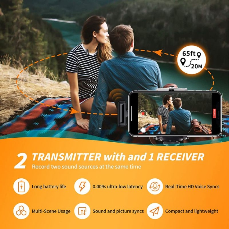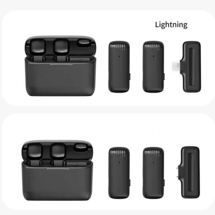 1. This dual wireless microphone system includes 2 transmitters and 1 receiver, not only can use a single microphone for recording, but also can record two sound sources at the same time during the live broadcast. It is very easy to use, just clip the wireless microphone on the collar, and plug the receiver into the 8 Pin port device, they will be connected quickly automatically. No APP or Bluetooth required, just plug and play.