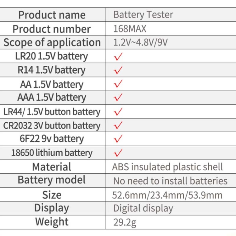 6. Universal AA AAA C D 9V button battery tester (Not include battery), put the battery between two points of the battery tester, the easy-to-read display will tell you whether there is power immediately
