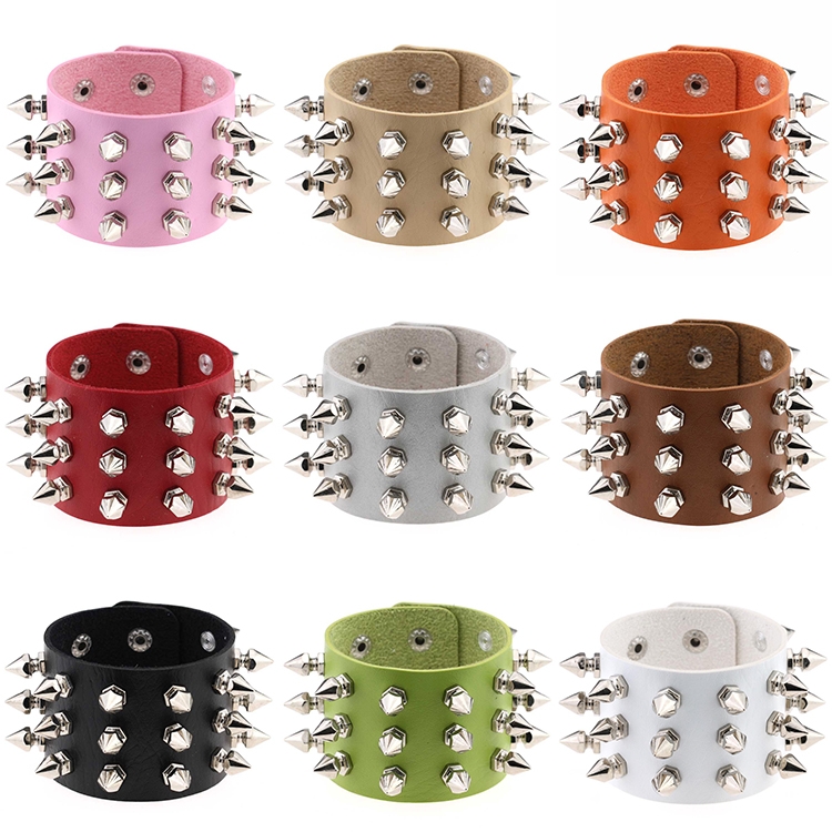 2 PCS European and American Punk Style Fashion Exaggerated Conical Tip 3 Rows Rivets Leather Bracelet, Random Color Delivery