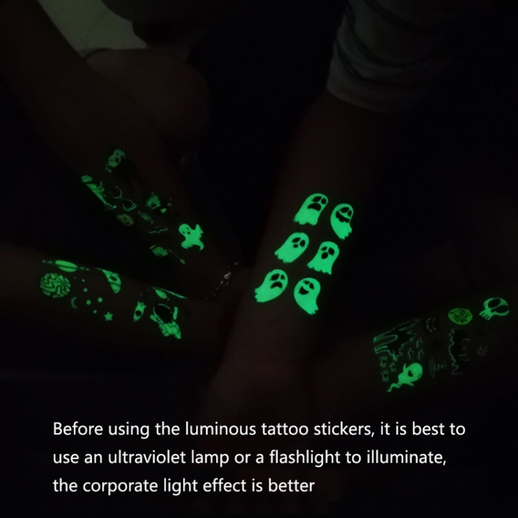 9. Note: before using the luminous tattoo stickers, it is use an ultraviolet lamp or a flashlight to illuminate, luminous effect is better