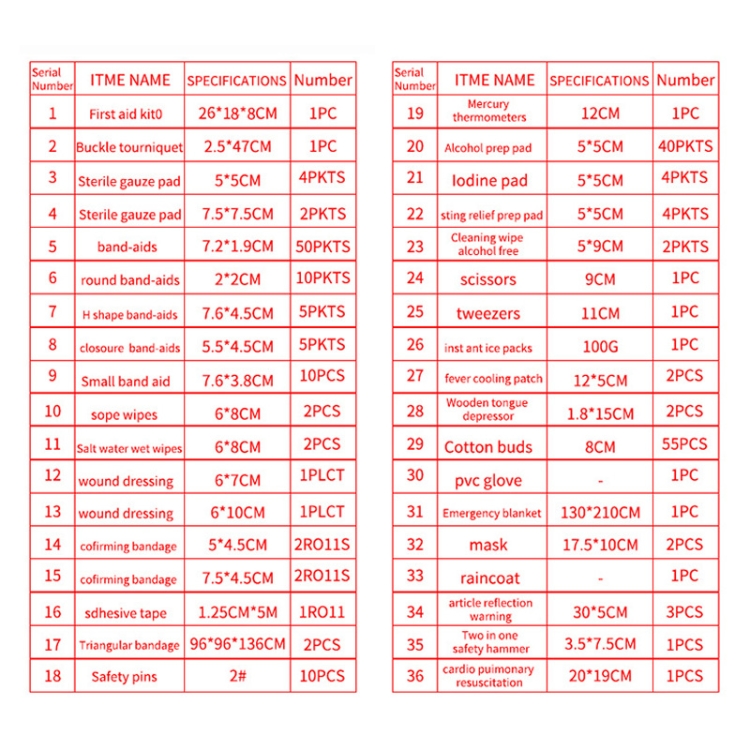 4. The product contains: first aid kit * 1, snap tourniquet * 1, sterile gauze sheet (5x5cm) * 4, sterile gauze sheet (7.5×7.55cm) * 2, conventional wound dressing * 50, round wound dressing * 10, H-type band-aid * 5, finger-tip-type band-aid * 5, small-scale band-aid * 10, soap liquid wipes * 2, saline wet wipes * 2, sterile accessories (6x7cm) * 1, sterile accessories Sticker (6x10cm) * 1, Elastic bandage (5×4.5cm) * 1, Elastic bandage (7.5×4.5cm) * 1, tape * 1, Triangle bandage * 2, Safety pin * 10, Mercury thermometer * 1, Alcohol disinfection * 40, iodophor * 4, mosquito repellent wipes * 4, disinfection wipes * 2, safety scissors * 2, plastic tweezers * 1, cold ice pack * 1, cooling stickers * 2, wooden tongue depressor * 2, cotton swabs * 55, PVC gloves * 1, first aid insulation blanket * 1, disposable masks * 2, raincoats * 1, reflective warning strips * 3, 2-in-1 safety hammer * 1, artificial breathing valve * 1