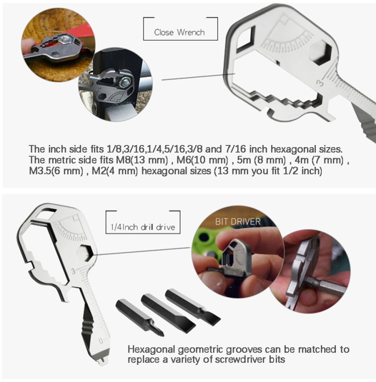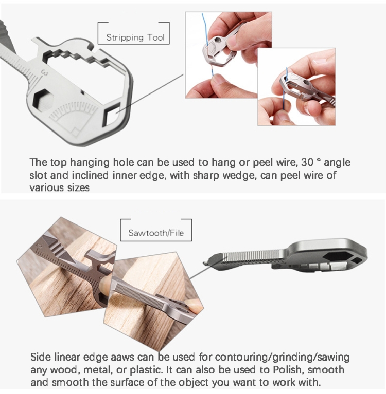 5. Function: bottle opener/box opener/file/measurement/hex wrench/screwdriver/bicycle wheel tightening wrench/closure wrench/wire stripper/1/4 inch drill driver/measure ruler/cutting device
