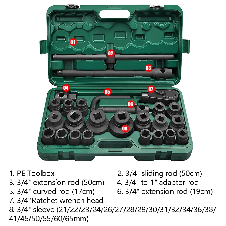 5. Packing list: PE tool box x1, 3/4 inch sliding rod (50cm) x1, 3/4 inch extension rod (50cm) x1, 3/4 inch to 1 inch adapter rod x1, 3/4 inch bending rod ( 17cm) x1, 3/4-inch extension rod (19cm) x1, 3/4-inch ratchet wrench head x1, 3/4-inch socket (21/22/23/24/26/27/28/29/30/31 /32/34/36/38/41/46/50/55/60/65mm) x20
