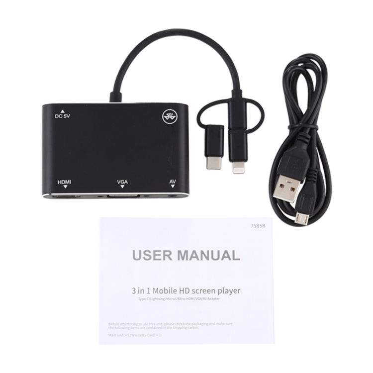 3 in 1 8 Pin + Micro USB + Type-C to AV + HDMI + VGA 15 Pin HD Screen Player Adapter Converter with Audio