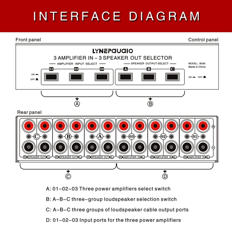 1. 3 power amplifiers push-button select switch input,3 sets of stereo speakers push-button select switch output (3 sets of speakers can be opened or closed independently)