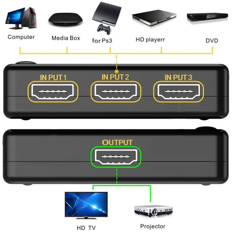 4) This kind of HDMI amplifier mini switcher routes high definition video(in multiple resolutions up to 1080p)and digital audio from any one of the several sources to display units.All inputs accommodate the connections of the high definition video sources simultaneously, compatible well for HD-DVD, SKY-STB, PS3, XBOX 36 etc.