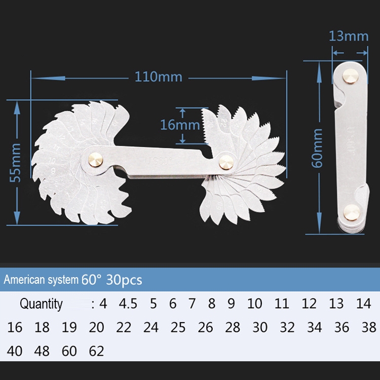 30 PCS US Screw Pitch Thread Blades 60 Degrees CR Stainless Steel Thread Gauge