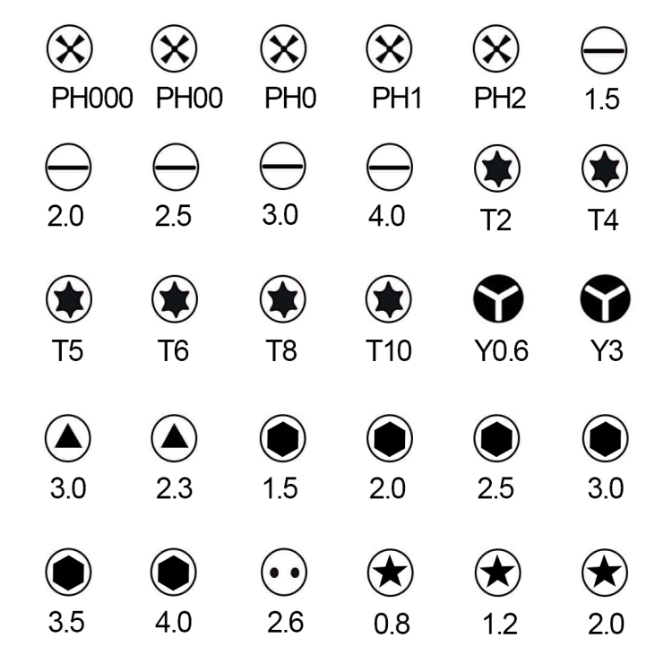 6. Screwdriver bit size: PH000 / PH00 / PH0 / PH1 / PH2 / 1.5 / 2.0 / 2.5 / 3.0 / 4.0 / T2 / T4 / T5 / T6 / T8 / T10 / Y0.6 / Y3.0 / 3.0 / 2.3 / 1.5 / 2.0 / 2.5 / 3.0 / 3.5 / 4.0 / U2.6 / 0.8 / 1.2 / 2.0