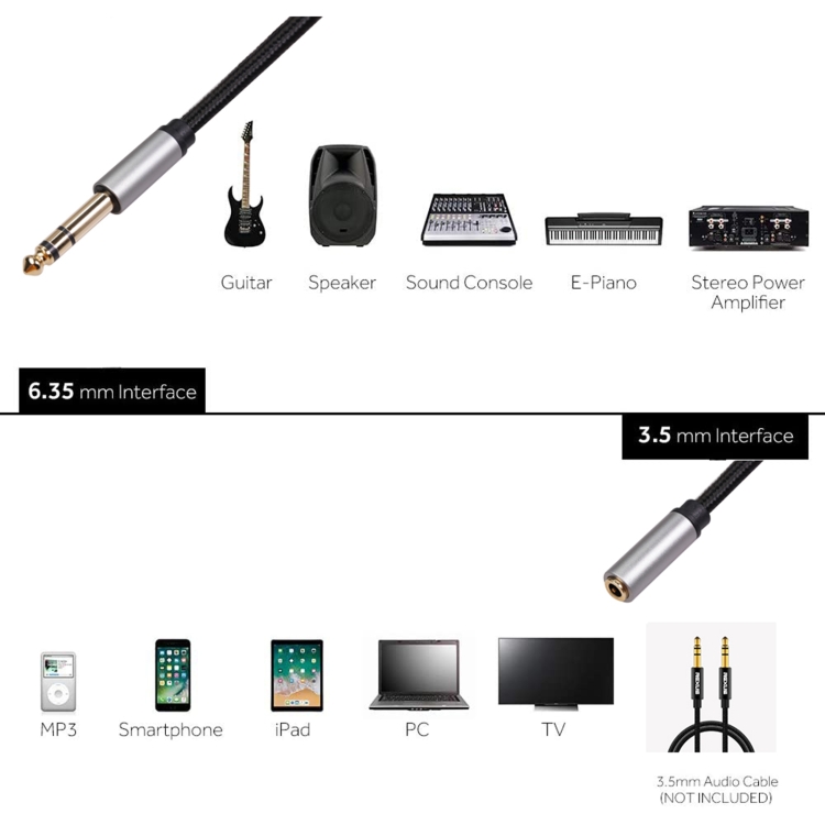 1. The product is to insert a 6.35mm male head into a 3.5mm female head adapter, which is used to connect smart phones, tablets, iPods or headphones with a standard 3.5mm plug to an audio device socket with a 6.35mm stereo. Such as: piano keyboard to 3.5mm adapter, guitar to headphone adapter, amplifier to headphone adapter.