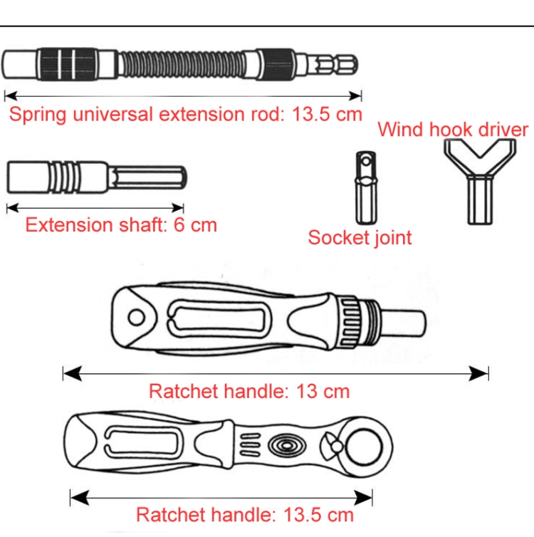 – 13cm ratchet handle x1, 13.5cm ratchet handle x1, 13.5cm spring universal rod x1, 6cm extension shaft x1, socket joint x1, wind hook driver x1
