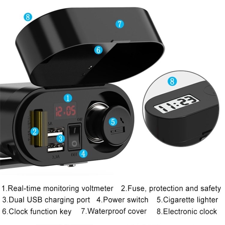 3A Motorcycle Multi-functional Cigarette Lighter Socket Voltmeter + Cigarette Lighter Socket + Dual USB