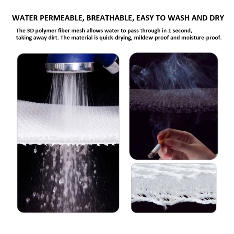 6. 3D polymer fiber mesh, the water flow can pass through in 1 second, taking away dirt, the material is quick-drying, mildew-proof and moisture-proof.