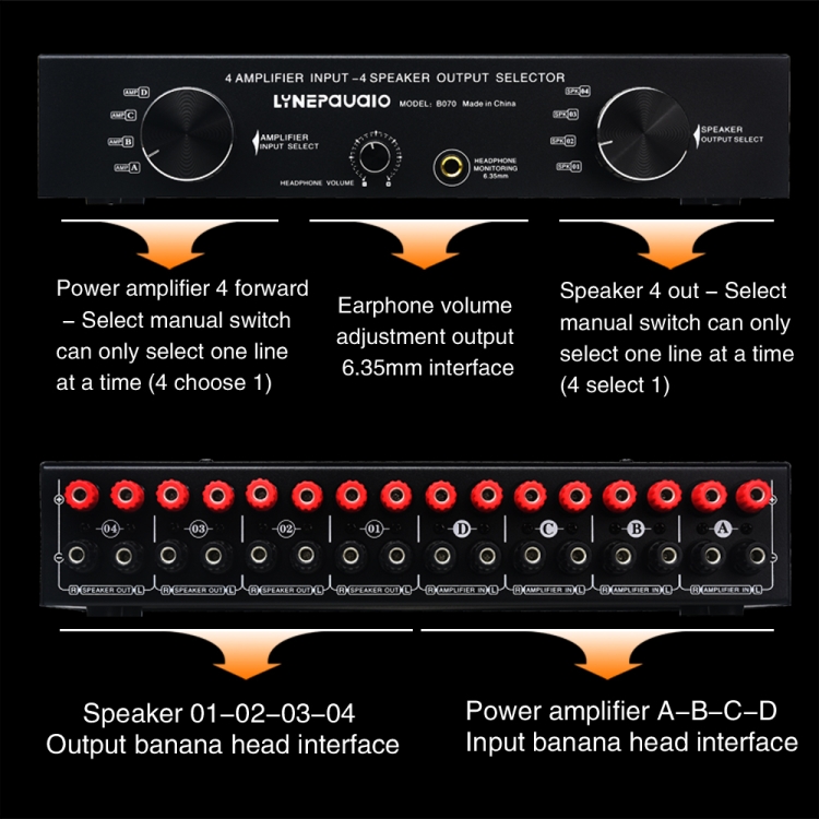 1. 4 power amplifier gear switch rotary selection switching input, 4 groups of stereo speaker gear switch rotary selection switching output