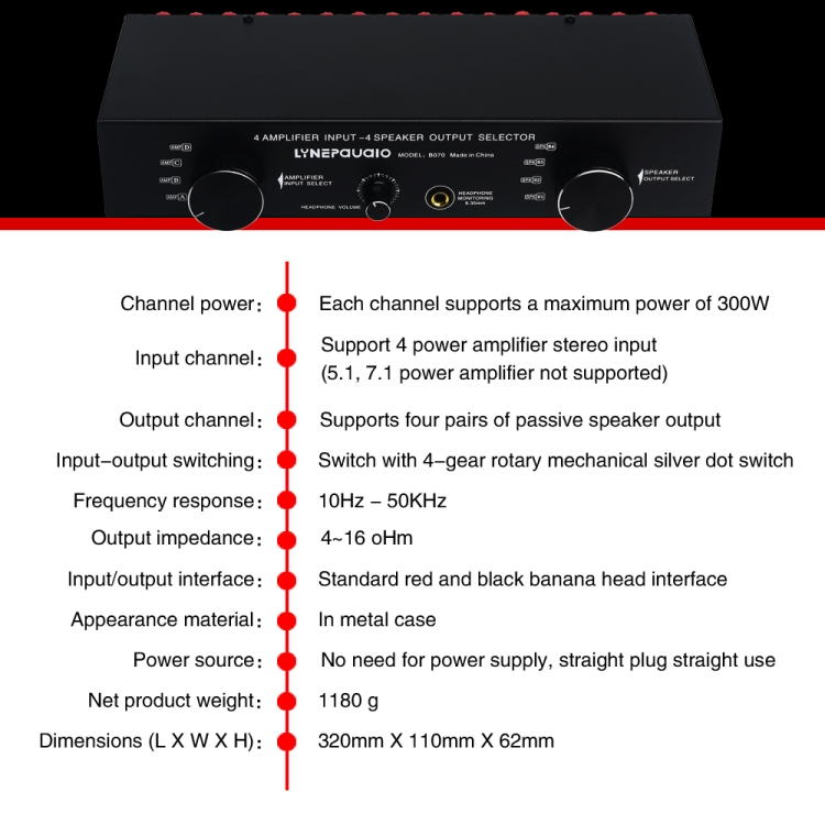 4. Support 4 to 16 ohms impedance stereo speakers, each channel support power up to 300W