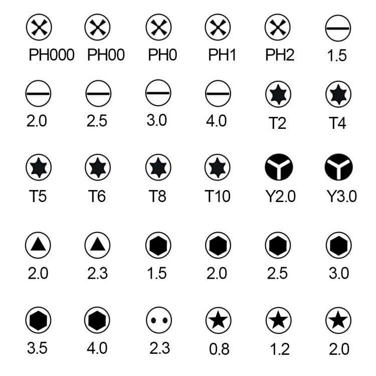 6. Screwdriver bit size: PH000 / PH00 / PH0 / PH1 / PH2 / 1.5 / 2.0 / 2.5 / 3.0 / 4.0 / M2.5 / M3.0 / M3.5 / M5.0 / M4.5 / M4.0 / 2.3 / 2.0 / Y3.0 / Y2.0 / T10 / T9 / T8 / T6 / T5 / T4 / M5.5 / 2.0 / 1.2 / 0.8 / U2.3 / 4.0 / 3.5 / 3.0 / 2.5 / 2.0 / 1.5
