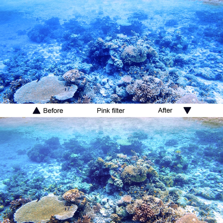 6. With 3 color filters: Purple filter helps color correction in freshwater lakes and reservoirs that appears green. Red filter for professional color correction under blue and tropical water, absorbed red color at depth of 5-25m, prevent taking pictures too blue or too green. Pink is designed to correct light blue or shallow water.