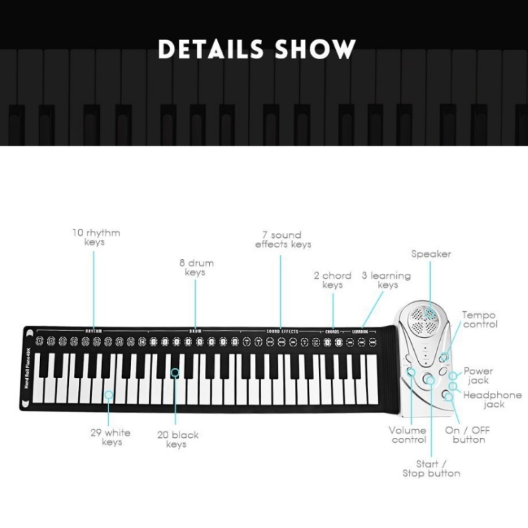 1. The 49-key rollable keys are standard keys, which can be rolled up, small in size and easy to carry