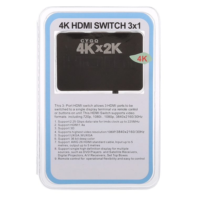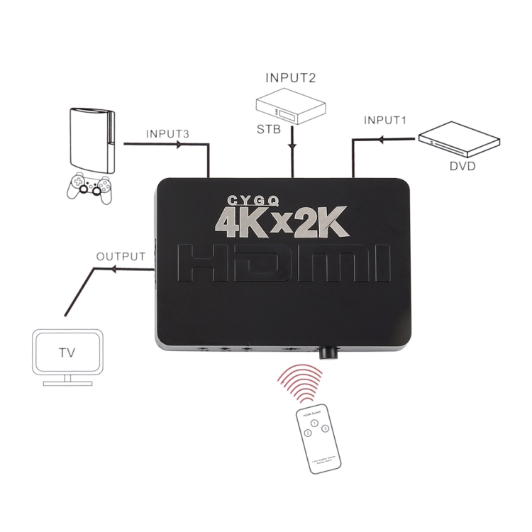 2. The HDMI switch allows three HDMI ports to be switched to a display terminal via the buttons on the remote control or device.
