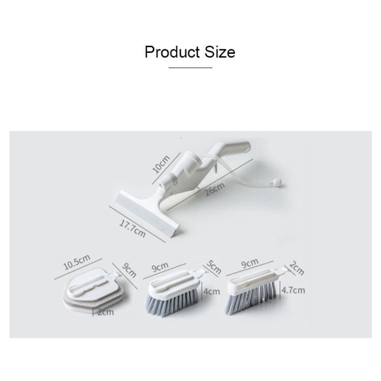 7. Dimensions: handle 26 cm long, glass scraper length 17.7 cm, cleaning brush 9x5x4 cm, sponge wiper 10.5x9x2 cm, slit brush 9x2x4.7 cm