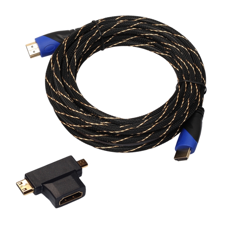 5m HDMI 1.4 Version 1080P Woven Net Line Blue Black Head HDMI Male to HDMI Male Audio Video Connector Cable with Mini HDMI & Micro HDMI & HDMI 3 in 1 Adapter Set