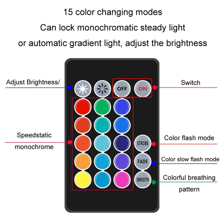 8. 15 color-changing modes, which can lock single-color steady light or automatic gradient light, and adjust the brightness