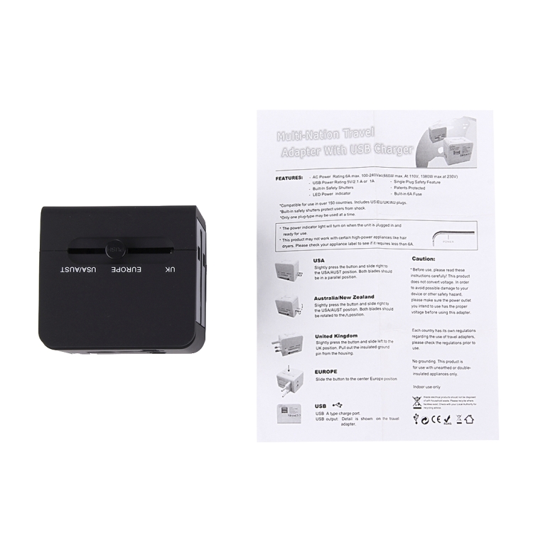2. Universal power socket with UK / EU / US / AU plug.